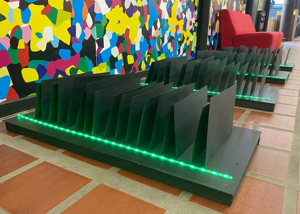 A total of 300 prints were produced, individually packed, and sealed in unmarked black envelopes. The sealed artworks were randomly allocated and arranged in four 'field row’ displays which were floor-mounted and back-lit with green light to symbolise growth. Placed strategically in high-traffic pedestrian areas on campus, by the end of each day, all the artworks had been eagerly collected.